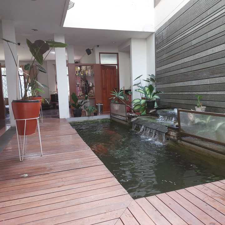 Ada Kolam ikan koi dan taman di luar.